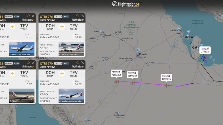 En apenas tres días, alrededor de 15 aeronaves han aterrizado en Teruel. Muchas de ellas pertenecen a Qatar Airways y han salido desde Doha, aunque no son las únicas.
